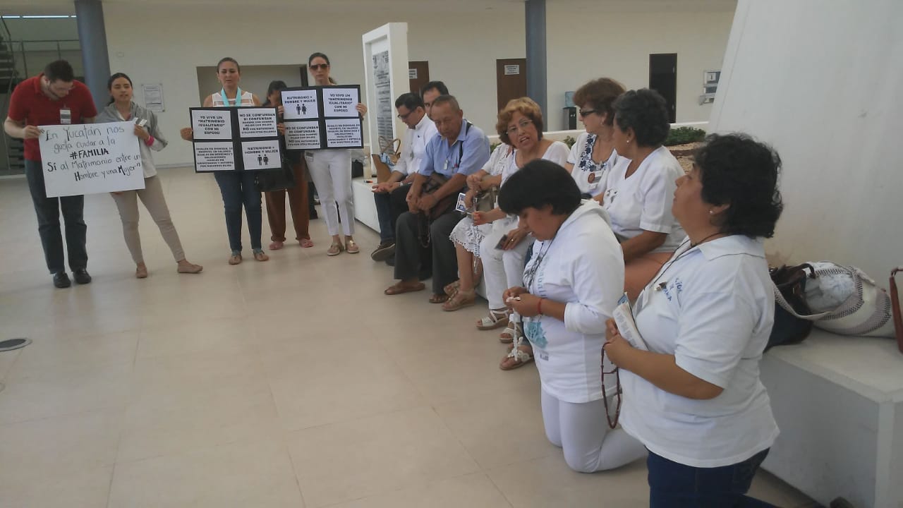 Momentos antes del inicio de la sesión de Pleno, en la que se votarán reformas a la Constitución Política del Estado de Yucatán en materia de matrimonio igualitario, decenas de los integrenates, en su mayoría mujeres, rezaban en espera de que no se apruebe el matrimonio hay en Yucatán.