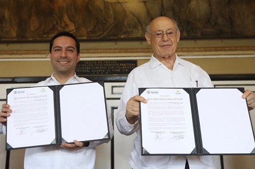 Desde el Salón de la Historia de la sede del Ejecutivo Estatal, el Gobernador Mauricio Vila Dosal y el consejero de dicha organización, Guillermo Güemez García, firmaron una carta compromiso, en cual se concreta esta colaboración que contribuye a disminuir el bajo rendimiento, el rezago y la deserción escolar; y que convierte al estado en el primero en el país en implementar una cobertura total a la población estudiantil.