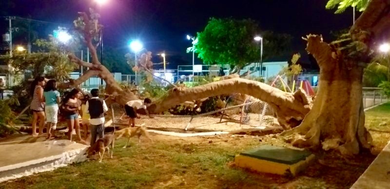 MÉRIDA, Yucatán, martes 25/06/19.- Un enorme árbol de flamboyán, ubicado en el parque de la colonia Miguel Hidalgo se vino abajo, y cinco niños resultaron heridos; vecinos de la zona afirmaron que desde hace tiempo le pidieron ayuda al diputado Víctor Merari Sánchez Roca, pero nunca se atendió el reporte.