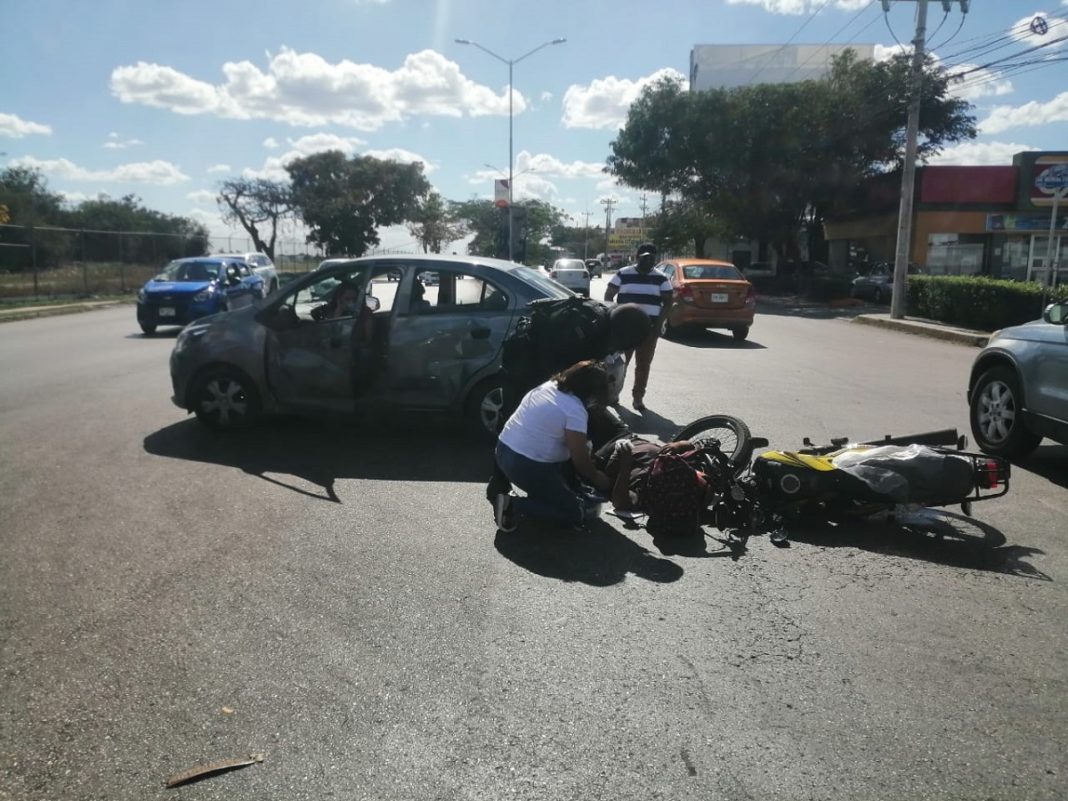 MÉRIDA, Yucatán, viernes 26/02/21.- La imprudente conductora de un Beat chocó contra una motociclista, luego de querer ganarle el paso, cuando intentó cruzar en la Avenida Aviación.