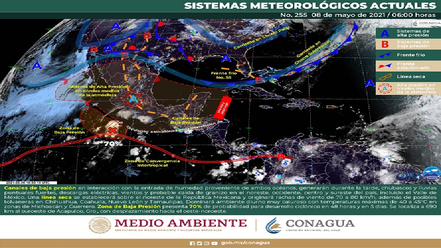 Debido al contenido de humedad que se mantendrá en la Península de Yucatán, aunado al fuerte calentamiento diurno por las altas temperaturas, habría chubascos dispersos en el noreste, centro y norte de Yucatán, en el centro y sur de Campeche, así como en el centro y sur de Quintana Roo. Se prevén temperaturas calurosas a muy calurosas durante el día y cálidas en la noche, con viento de dirección este-sureste cambiando al noreste de 15 a 25 km/h con rachas de 45 km/h.