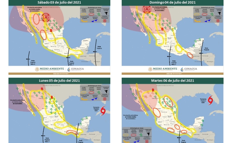 Hoy sábado, la onda tropical 7 se desplazará lentamente sobre Oaxaca e interaccionará con un canal de baja presión sobre el oriente de México, manteniendo probabilidad de lluvias fuertes a muy fuertes, descargas eléctricas, vientos fuertes y posibilidad de caída de granizo sobre el oriente y sur de México. Además, canales de baja presión en el interior de la República Mexicana, inestabilidad en la atmósfera superior y la entrada de humedad de ambos océanos ocasionarán lluvias de fuertes a muy fuertes en el noroeste, occidente y centro del país, incluido el Valle de México, con lluvias intensas en Sonora. También, prevalecerá ambiente de caluroso a muy caluroso con temperaturas superiores a 40°C en Baja California y Sonora.
