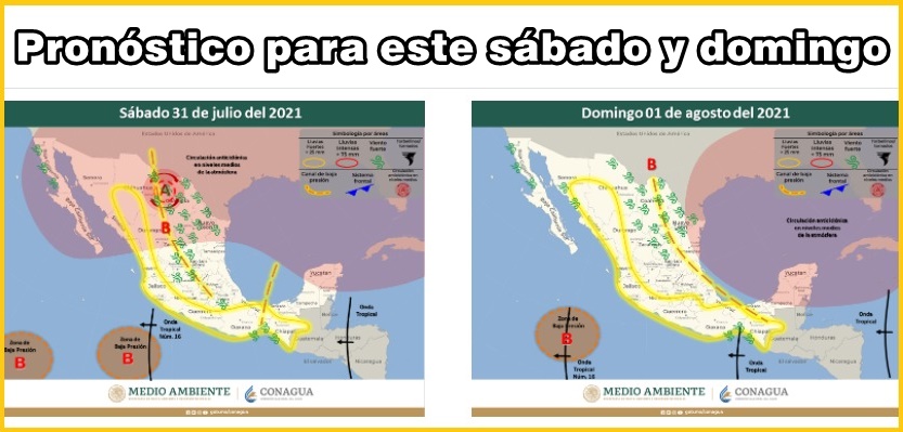 Hoy sábado, la onda tropical 16 se extenderá frente a las costas de Jalisco, continuará interactuando con una zona de baja presión con probabilidad de desarrollo ciclónico y con un canal de baja presión que se extenderá sobre la Sierra Madre Occidental, lo que ocasionará lluvias de muy fuertes a intensas sobre estas regiones, además de intensas, descargas eléctricas, vientos fuertes y posible caída de granizo en Durango, Sinaloa, Nayarit y Jalisco.
