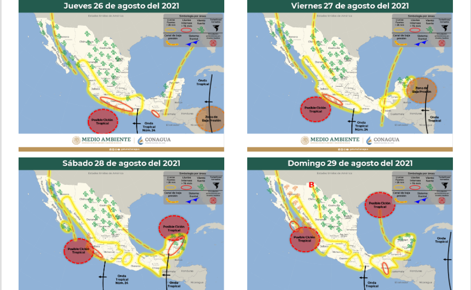 Además, la onda tropical 24 recorrerá el sur y occidente del país, mientras que una nueva onda tropical recorrerá el sureste de México durante el sábado y domingo, lo que ocasionará lluvias de fuertes a muy fuertes en el noroeste, occidente, centro, oriente, sur y sureste de la República Mexicana, con tormentas intensas en zonas de Baja california Sur, Jalisco, Colima, Michoacán, Guerrero, Chiapas y en la Península de Yucatán, además de rachas fuertes de viento y oleaje elevado en las costas de Baja california Sur, Sinaloa, Nayarit, Jalisco, Colima, Michoacán, Guerrero, Yucatán y Quintana Roo.