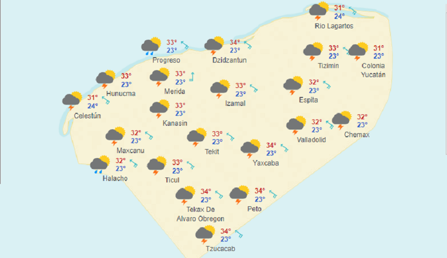 El ambiente será templado en la mañana y de cálido a caluroso durante la tarde, con temperaturas máximas de 34 a 36º c en Yucatán y Campeche y de 33 a 35º C en Quintana Roo y viento del Sureste de 15 a 30 km/h.