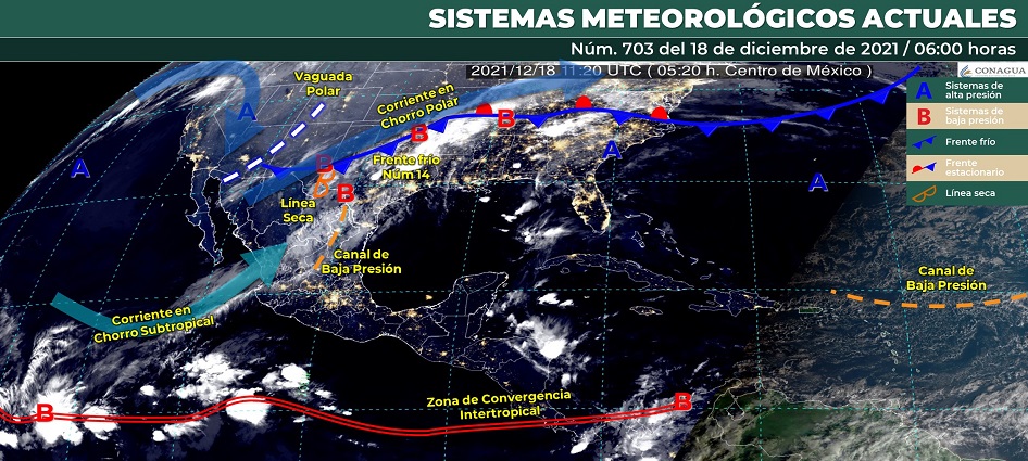 La masa de aire frío que impulsó al frente frío 14 y una vaguada polar ocasionarían hoy un marcado descenso de temperatura en el noroeste, norte y noreste del país, con probable caída de aguanieve o nieve en zonas montañosas de Sonora, Chihuahua, Coahuila y Durango y “Norte”, con rachas de 60 a 70 km/h en las costas de Tamaulipas.
