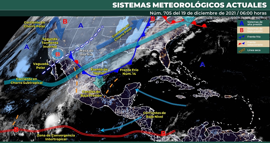 Las condiciones anteriores se deberán al ingreso de aire marítimo tropical proveniente del Mar Caribe hacia la región, en combinación con una vaguada sobre la Península de Yucatán, que ocasionarían lloviznas e intervalos de lluvias en Yucatán, chubascos en Quintana Roo, así como chubascos con lluvias fuertes en Campeche.