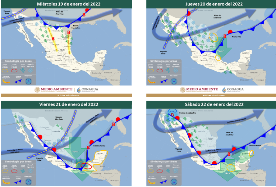 Hoy en la noche, un nuevo frente frío y su masa de aire polar asociada ingresaran sobre el norte y noreste de México, de modo que aumenta la probabilidad de lluvias, marcado descenso en la temperatura y viento con rachas de 60 a 70 km/h en Chihuahua, Coahuila y Nuevo León. Se pronostican condiciones para la caída de aguanieve o nieve en zonas montañosas de Chihuahua y Coahuila durante esta noche y en las primeras horas del jueves.