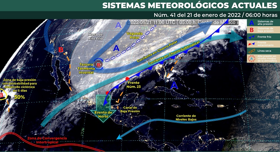 El sábado, una nueva masa de aire frío reforzará al frente frío y ocasionará un “Norte” en el litoral del Golfo de México, en la Península de Yucatán, el Istmo y en el Golfo de Tehuantepec.