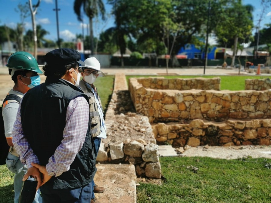 MÉRIDA, Yucatán, martes 08/02/22.- Arqueólogos encabezados por Eduardo López Calzada, director del Instituto Nacional de Antropología e Historia en Yucatán, supervisan avances de los trabajos de restauración y conservación en la plaza principal de Pisté.