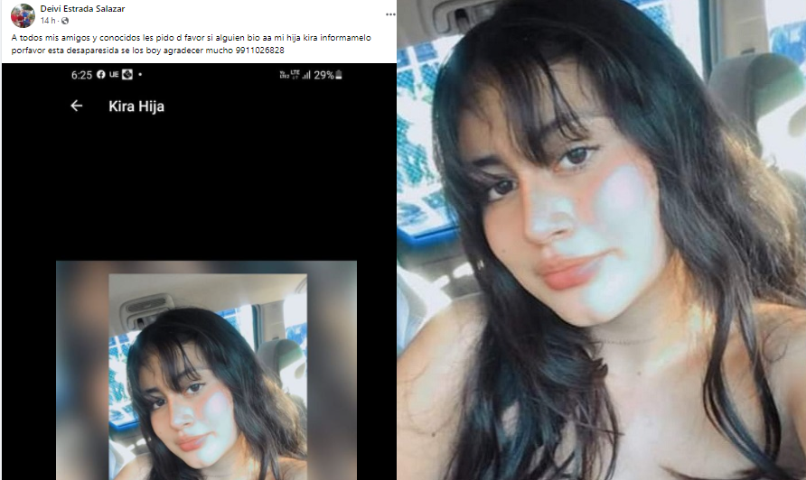 “A todos mis amigos y conocidos les pido de favor si alguien, vio a mi hija Kira, infórmamelo por favor está desaparecida, se los voy agradecer mucho 9911026828”, publicó en sus redes sociales don Deivi.