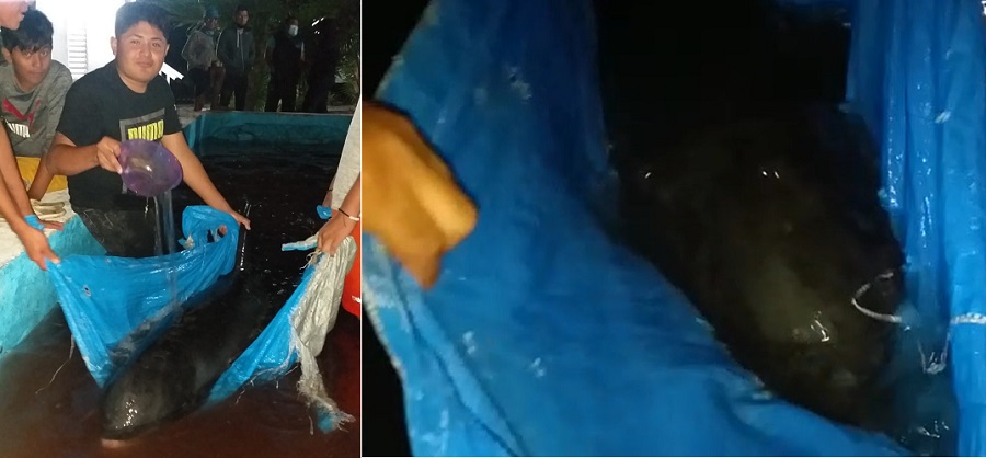 DZILAM BRAVO, Yucatán, lunes 14/03/22.- Un grupo de jóvenes de este puerto rescató anoche a una orca pigmea que recaló en la playa, donde quedó varada.