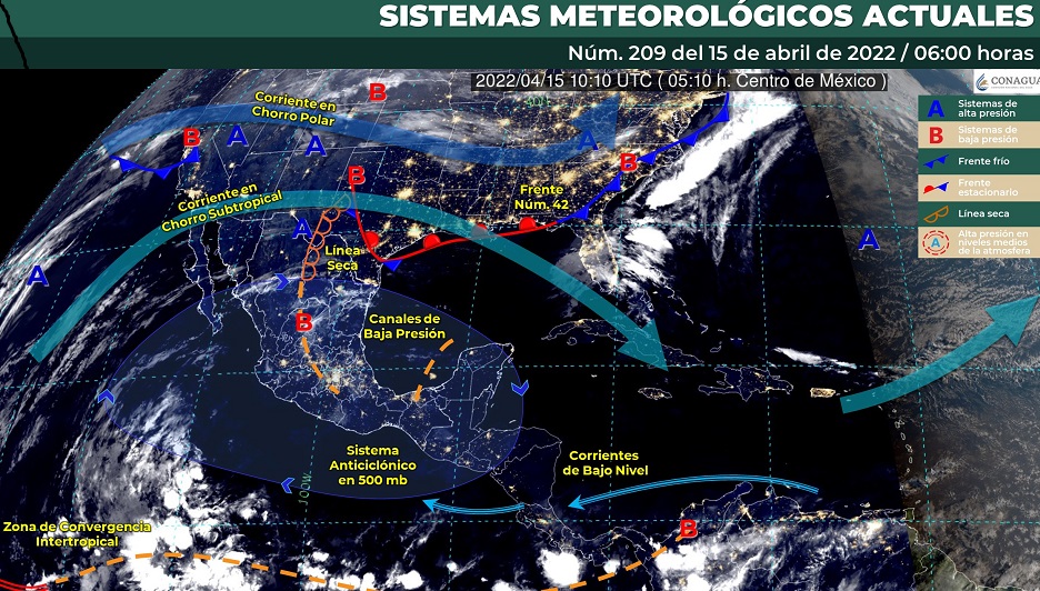 Un canal de baja presión se extenderá desde el noreste hasta el centro y oriente de México y asociado con una línea seca sobre Coahuila y con la entrada de humedad proveniente del Golfo de México, Océano Pacífico y del Mar Caribe ocasionará lluvias y chubascos dispersos así como descargas eléctricas en esas regiones. Se pronostica posible caída de granizo en zonas de Hidalgo, Estado de México, Ciudad de México, Tlaxcala, Puebla y Veracruz. Por otra parte, un sistema anticiclónico en niveles medios de la atmósfera propiciará una onda de calor con ambiente de caluroso a muy caluroso sobre la mayor parte de la República Mexicana y temperaturas máximas superiores a 35° C en 22 estados del país. El frente dejó de afectar al territorio mexicano.