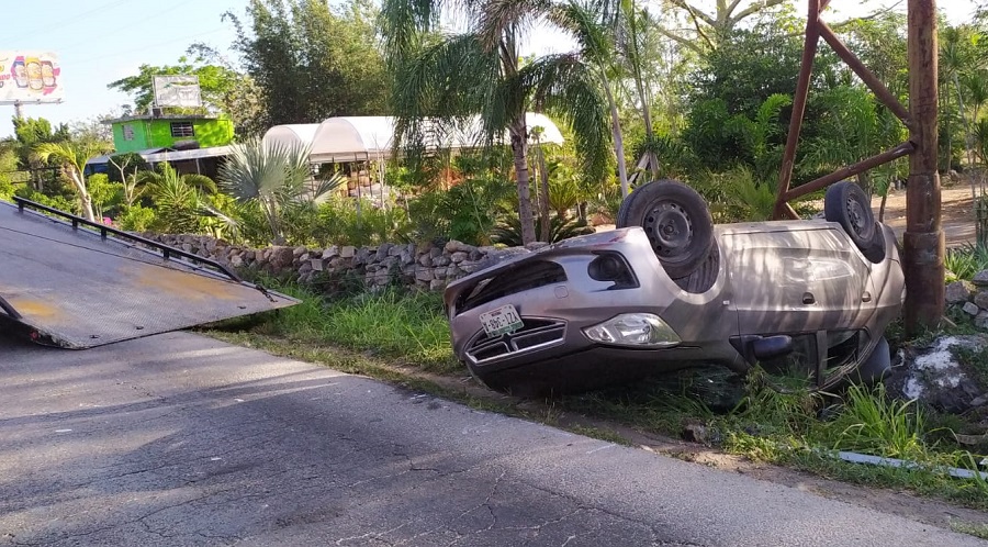 El accidente ocurrió en el kilómetro 24 del Periférico, a la altura del puente a Motul, luego que en plena curva el conductor perdió el control del auto, placas YZT-343-A, se salió de la cinta asfáltica, se estrelló contra un poste de metal y luego volcó, de modo que el vehículo quedó con las llantas para arriba.