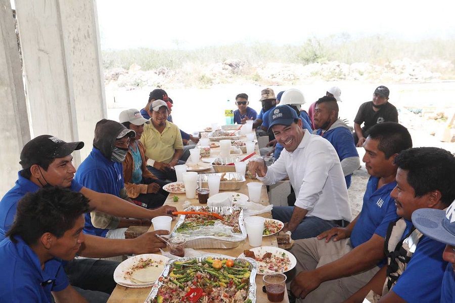En una amena plática y convivencia con 28 alarifes que trabajan en la construcción de 56 casas tipo ensamble del complejo habitacional “Lajas Yucatán” ubicado al norte de Mérida, Vila Dosal compartió algunos de los proyectos que se están realizando para continuar con la transformación de Yucatán.