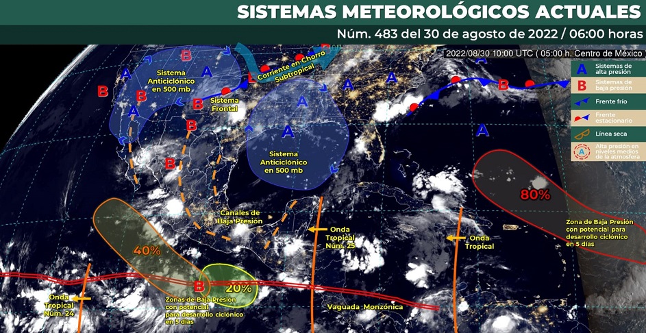 De mañana miércoles al viernes en el estado se esperan lluvias fuertes, con calor de 35 a 40° C, debido a la onda tropical 25, que recorrerá el sur del país, a canales de baja presión que se extenderán sobre el interior, noreste, oriente y sureste de la República Mexicana, a inestabilidad atmosférica superior y a humedad del Océano Pacífico, Golfo de México y del Mar Caribe.