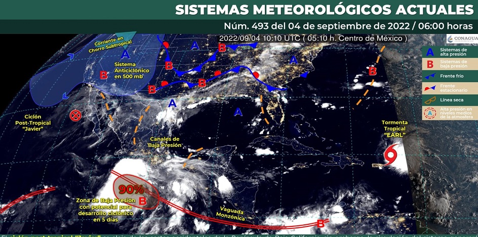 PRONÓSTICO PARA LA PENÍNSULA: Se extenderá un canal de baja presión sobre el suroeste de la Península de Yucatán lo que ocasionaría chubascos con tormentas aisladas al centro y sur de Quintana Roo; en el sur, centro y noroeste de Yucatán, así como en el suroeste y centro de Campeche.