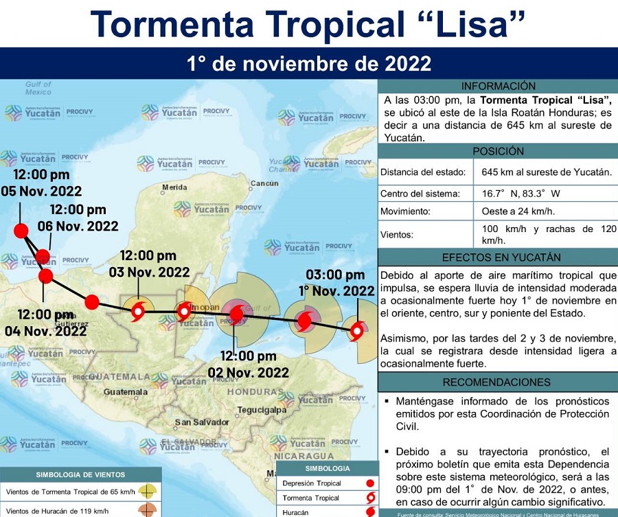 Como publicamos en la mañana, de acuerdo con el pronóstico del SMN, el ciclón tropical “Lisa” seguirá su ruta al oeste y el miércoles tocaría tierra en Belice, donde se debilitará rápidamente; el jueves estaría sobre Guatemala y en su paso ocasionaría lluvias de muy fuertes a intensas en el sureste de México y en la Península de Yucatán.