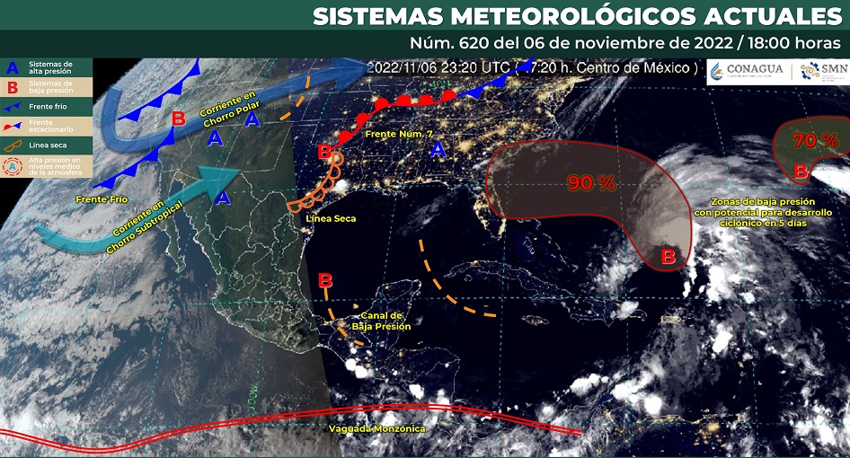El frente 7 ha dejado de afectar al país, no obstante, el aire frío asociado mantendrá el ambiente muy frío con heladas al amanecer en zonas altas del noroeste y norte de la patria. Una línea seca produce vientos de 40 a 60 km/h en Nuevo León y Tamaulipas.