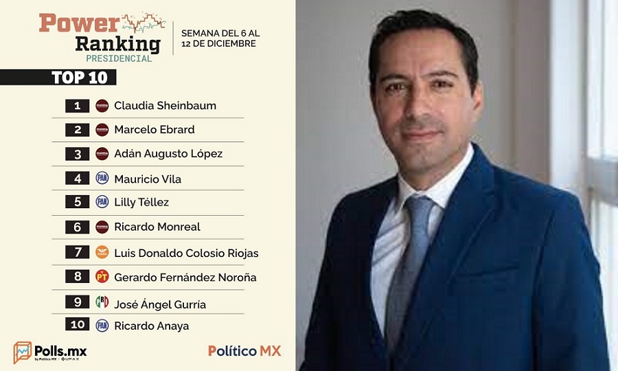 MÉRIDA, Yucatán, martes 06/12/22.- El gobernador de Yucatán, Mauricio Vila Dosal, dio un gran salto en las preferencias ciudadanas a Presidente de México, pues del octavo pasó al cuarto puesto, según el Power Ranking Presidencial de Polls.mx, rumbo al 2024.