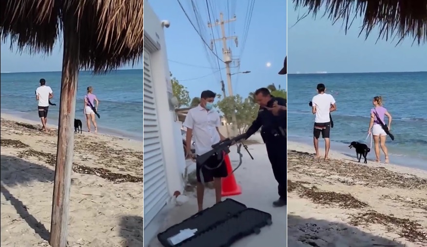 MÉRIDA, Yucatán, martes 04/04/2023.- Una mujer, al parecer estadounidense, alarmó a vecinos y vacacionistas de Chicxulub Puerto, donde se paseó en la playa con un rifle aparentemente de alto calibre, acompañada de un joven y dos perros.