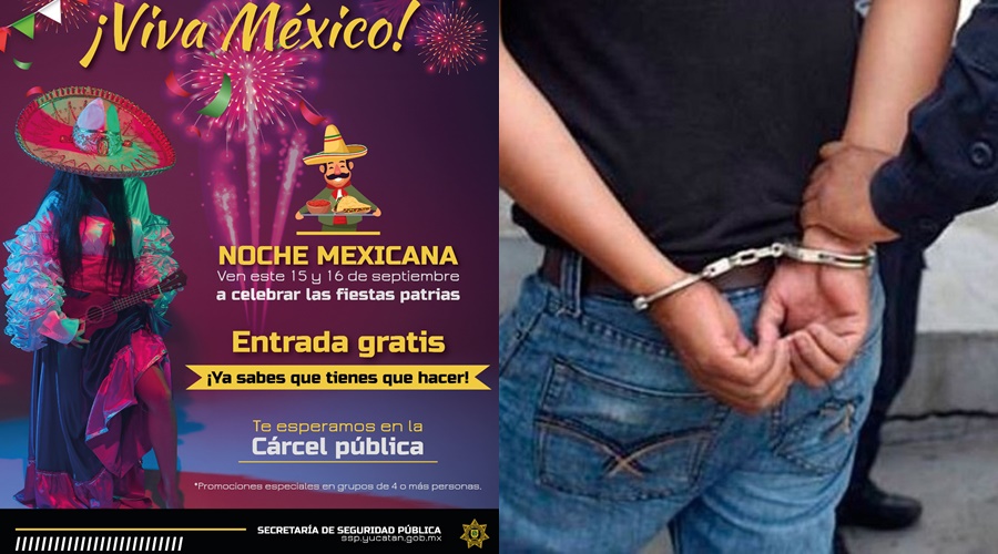 MÉRIDA, Yucatán, viernes 15/09/23.- Celebra las fiestas patrias, escandaliza o maneja ebrio esta noche y… Te esperamos en la cárcel!”, advierte con ironía o burla, pero ahora llamada sicología invertida la SSP, a fin de inhibir actos delictivos.
