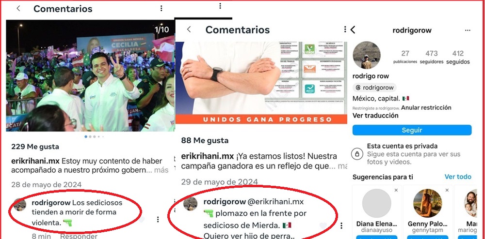 El 29 de mayo, en otra publicación de Rihani González, que para esas fechas cerraba su campaña, el mismo sujeto le lanzó otra amenaza: “plomazo en la frente por sedicioso de Mierda. Quiero ver hijo de perra (sic)”, en el que incluye también imágenes de una pistola y otra de una bandera de México.