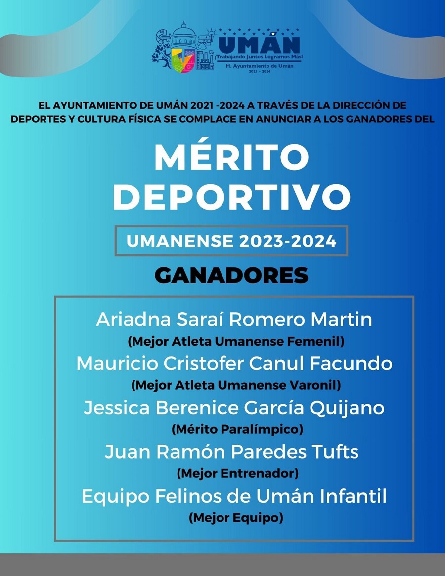 Los galardonados son Ariadna Saraí Romero Martín, Mejor Atleta Umanenses Femenil; Mauricio Cristofer Canul Facundo, Mejor Atleta Umanense Varonil; Jessica Berenice García Quijano, Merito Paralímpico; Juan Ramón Paredes Tufts, Mejor Entrenador, y Equipo Felinos de Umán Infantil, Mejor Equipo.