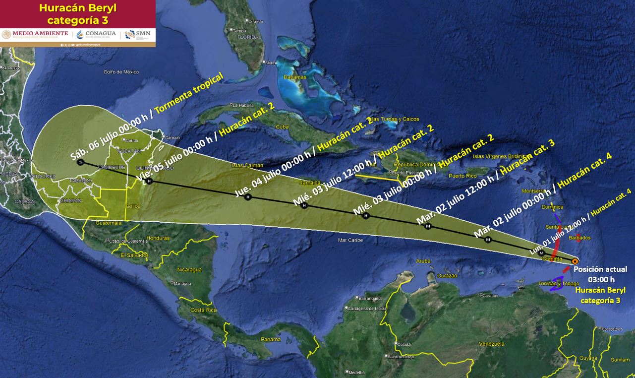 De acuerdo con el reporte de las 03:15 de la madrugada de hoy lunes, “Beryl” pasaría a categoría 4 al mediodía y así se mantendrá hasta la 00:00 horas del martes, para luego volverse categoría 3 el martes al mediodía.