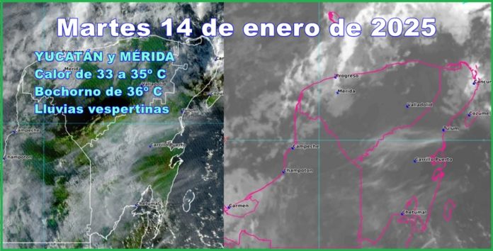 MÉRIDA, Yucatán, martes 14/01/24.- Luego de un amanecer con lloviznas muy ligeras, hoy martes en Yucatán se espera calor de 33 a 35º C, bochorno de 36º C y lluvias vespertinas, debido a efectos indirectos del frente frío 23, estacionado frente a la Península de Yucatán.