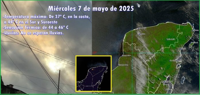 MÉRIDA, Yucatán, miércoles 07/05/25.– Hoy miércoles, a la mitad de la semana, sería el día más caluroso del año, con máximas de hasta 44º C en el Sur y Suroeste de Yucatán, con una sensación térmica de 46º y mínimas probabilidades de lluvias.
