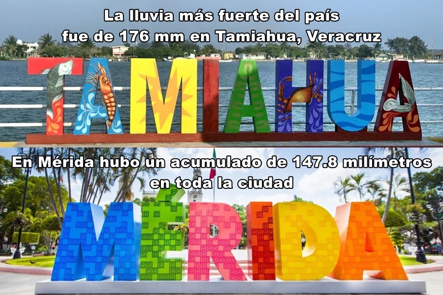 Respecto a las lluvias, en Mérida hubo un acumulado de 147.8 milímetros en toda la ciudad, y la más fuerte registrada fue de 42.6 mm en Chocholá; en la patria grande la lluvia más fuerte fue de 176 mm en Tamiahua.