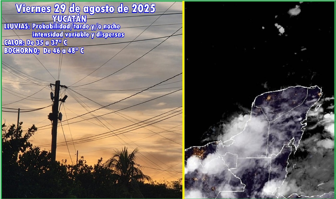MÉRIDA, Yucatán, viernes 29/08/25.– Debido a un canal de baja presión y al calentamiento diurno, hoy viernes en Yucatán hay probabilidades de lluvias, en la tarde y en la noche, con temperaturas máximas de 37º C y sensación térmica de 48º C.