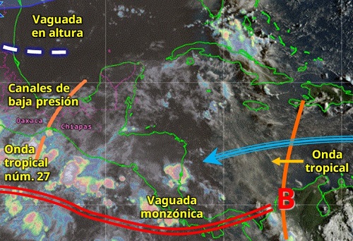 En la mañana se espera cielo medio nublado y ambiente cálido, en tanto que en la tarde el ambiente será de cálido a caluroso, con temperaturas mayores a 35°C en zonas de ambos estados. El cielo será nublado y habría lluvias y descargas eléctricas, además de fuertes rachas de viento en Campeche y en Quintana Roo. En Campeche el viento soplará del Este, de 20 a 30 km/h y rachas de 40 a 60 km/h, mientras que en Quintana Roo será de 10 a 20 km/h y rachas de 30 a 40 km/h.