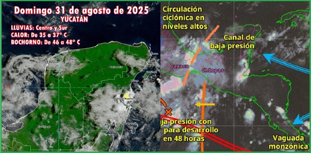 MÉRIDA, Yucatán, domingo 31/08/25.- Debido la onda tropical 29, a un canal de baja presión y al calentamiento diurno, hoy domingo en Yucatán hay probabilidades de lluvias, , con temperaturas máximas de 37º C y sensación térmica de 48º C.