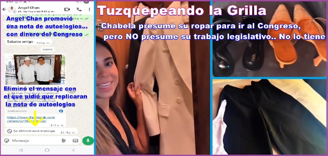 MÉRIDA, Yucatán, martes 23/09/25.- Volvemos a Tuzquepear, hay mucho material: Isabel Rodríguez presume, si presume como escoge su ropa para ir al Congreso de la Unión, en vez de presumir su trabajo legislativo; además, a los Letz Hé de Vil Pel los corrieron a patadas del Poder Ejecutivo, donde robaban sueldos de hasta 50 mil pesos; finalmente, Ángel Chan hizo encabronar al Huacho Letz Hé Wilmer Monforte… ya verán porque.