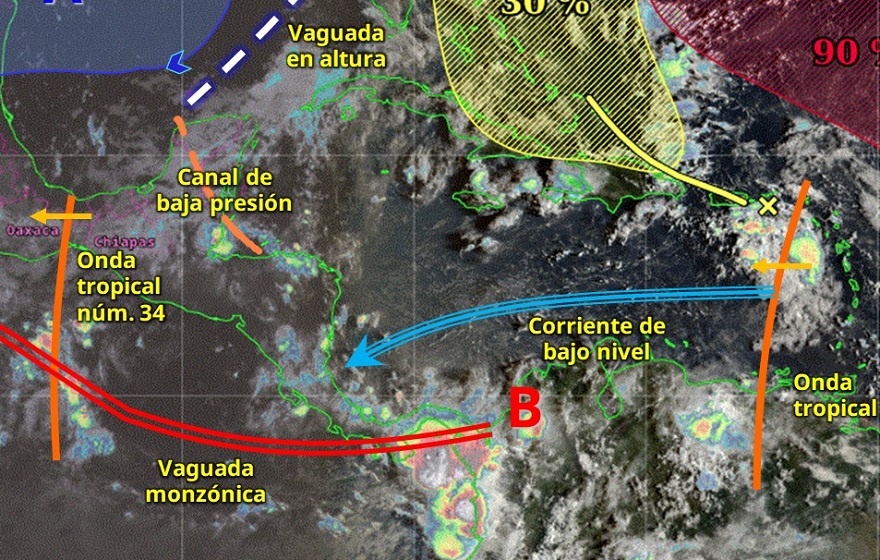 Además, debido a los efectos de una vaguada y el calentamiento diurno propio de la zona formadora de tormentas. se pronostican lluvias y tormentas vespertinas y/o nocturnas en varias partes del estado.