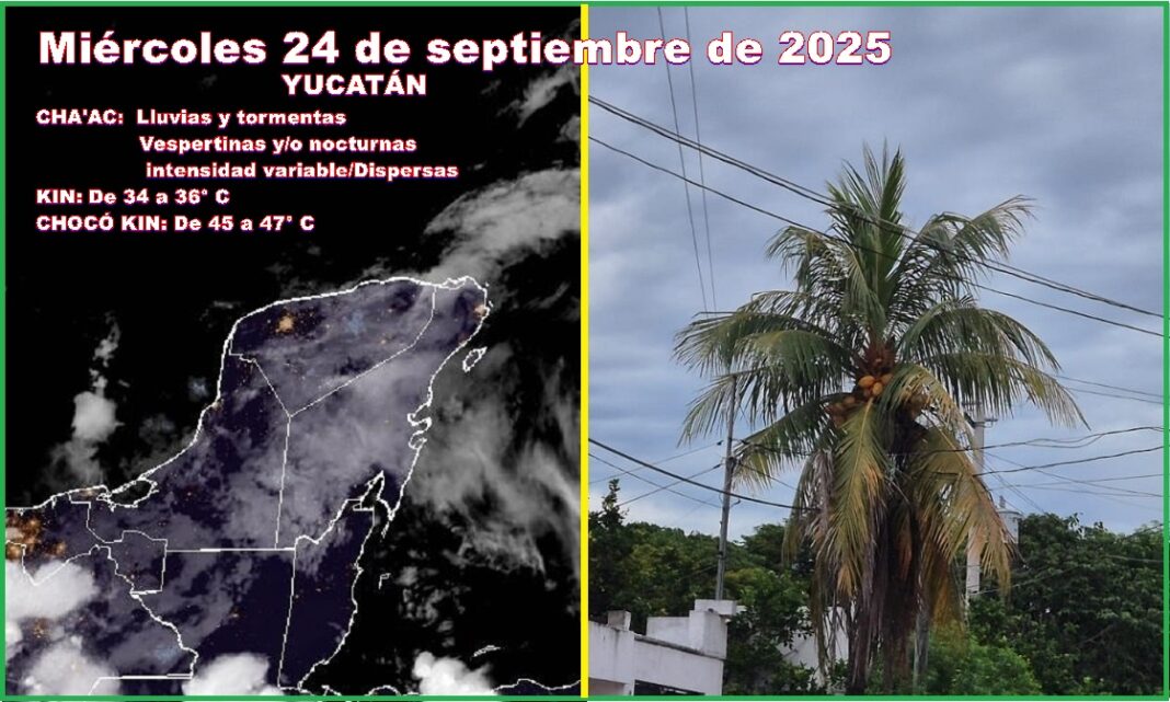 MÉRIDA, Yucatán, miércoles 24/09/25.- Para hoy, las temperaturas máximas en Yucatán serán de 32º, en la costa, a 36º C en el Oriente del estado, en tanto que el bochorno seguirá alto y será de 45 a 47º C.