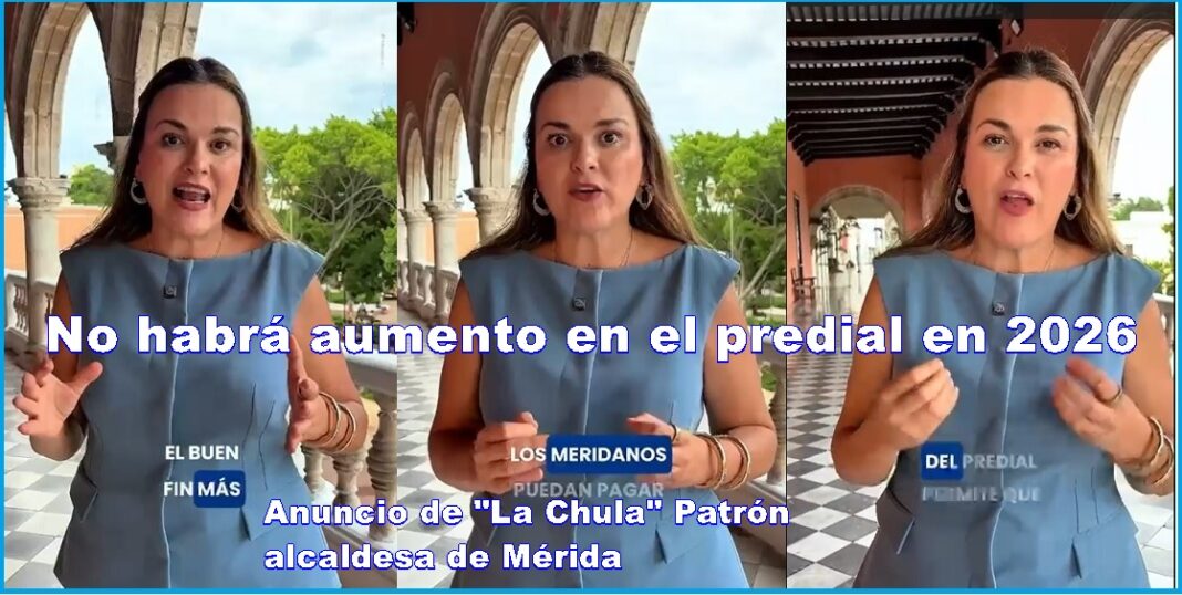 MÉRIDA, Yucatán, jueves 25/09/25.- No habrá aumento del impuesto predial para el año 2026 en Mérida y se mantendrá con los valores catastrales vigentes desde 2024, afirmó la alcaldesa, Cecilia Patrón Laviada.