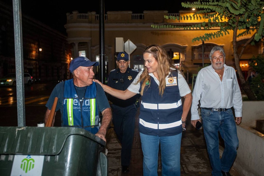 MÉRIDA, Yucatán, viernes 26/09/2025.- Para verificar el orden en el Centro Histórico de Mérida tras la lluvia y apagón que se registraron la tarde de este viernes, la presidenta municipal Cecilia Patrón Laviada realizó rondín y caminata acompañada de elementos de la Policía Municipal y personal de Servicios Públicos.