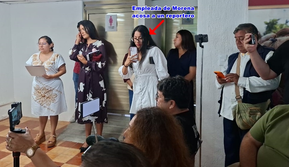 MÉRIDA, Yucatán, viernes 26/09/25.- En un franco acoso y violencia física, psicológica y clara intimidación, Morena, por medio de sus empleados les toma fotografías a los reporteros que hacen preguntas incómodas, mientras a sus Letz Hé no los molestan.
