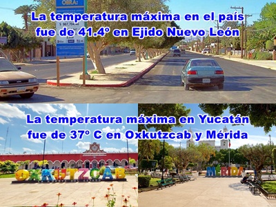 MÁXIMAS: Yucatán, 37º C, Oxkutzcab y Mérida Oriente y Norte; México, 41.4º, Ejido Nuevo León, Baja California