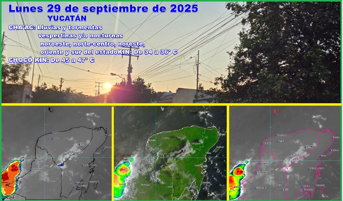 MÉRIDA, Yucatán, lunes 29/09/25.– Para hoy, debido a los efectos de una vaguada y al paso de una onda tropical en Yucatán se pronostican temperaturas máximas de 31º, en la costa, a 36º C, en el Oriente del estado, y el bochorno seguirá alto y será de 45 a 47º C.