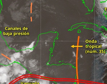 Cielo de parcialmente nublado a nublado, con probabilidad de tormentas fuertes en ambos estados, debido a la humedad y al paso de la onda tropical 35, que actualmente está por Centroamérica, y a una vaguada en niveles medios y altos de la tropósfera. En donde haya tormenta se daría mucha actividad eléctrica y fuertes vientos. Ambiente de caluroso a muy caluroso durante el día y cálido en la noche, con vientos de dirección variable, de 15 a 25 km/h, con rachas mayores a 40 km/h.