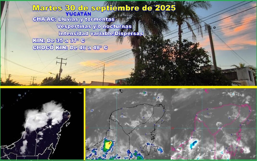 MÉRIDA, Yucatán, martes 30/09/25.- El paso de la onda tropical 35 y el calentamiento diurno ocasionarán en Yucatán, hoy martes, último día del mes, lluvias y tormentas, vespertinas y/o nocturnas, con calor de 35 a 37º C y bochorno de 48º C.