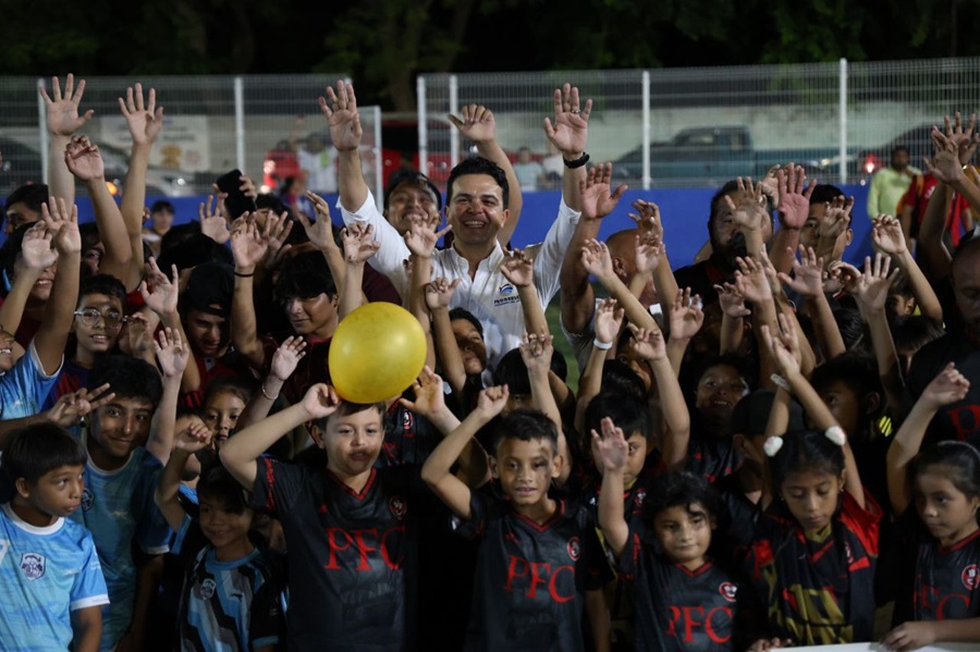 PROGRESO, Yucatán, martes 30/09/2025.- En un emocionante partido y la tradicional patada inaugural de la Liga Municipal Infantil y Juvenil, el alcalde Erik Rihani González reinauguró anoche las instalaciones del campo “Benito Juárez García”, un espacio que busca impulsar el talento deportivo de la niñez y juventud del municipio.
