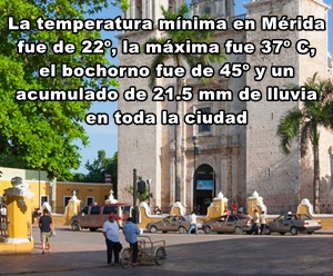 MÉRIDA: Mínima, 22º C en el Norte y en el Oriente; Máxima, 37º C, Norte; Bochorno, 45º C; 11.6 mm, Poniente, y acumulado de 21.5 mm en toda la ciudad
