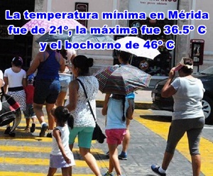 Mínima, 21º C en el Oriente; Máxima, 36.5º C, Poniente; Bochorno, 46º C; 41.4 mm, Mérida Sur y 85.2 mm acumulados en toda la ciudad