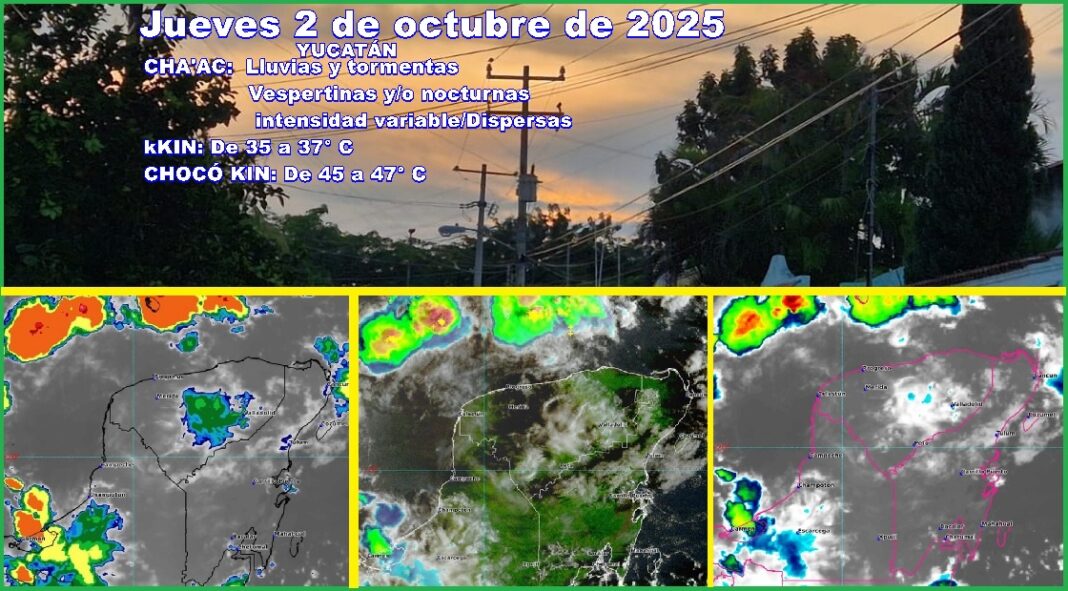 MÉRIDA, Yucatán, jueves 02/10//25.- Hoy jueves en Yucatán hay potencial de lluvias y tormentas vespertinas y/o nocturnas, con calor de 35 a 37º C, en el Sur del estado, y bochorno de 47º C.