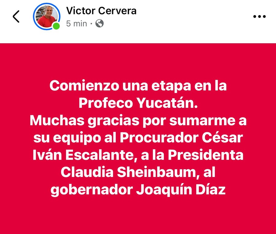 MÉRIDA, Yucatán, jueves 02/10/2025.- A cuentagotas siguen fluyendo los nombramientos en la delegaciones federales de Yucatán. Hoy Víctor Cervera Hernández, quien hace unos meses renunció a la dirección del IYEM (Instituto Yucateco de Emprendedores), anunció que será el delegado de Profeco Yucatán.